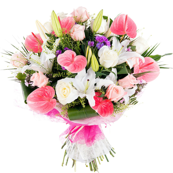 Ramo de anthuriums rosas, rosas blancas, lisianthus, liliums y diferentes verdes.